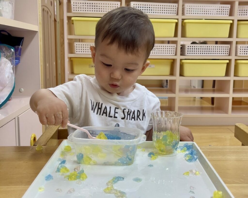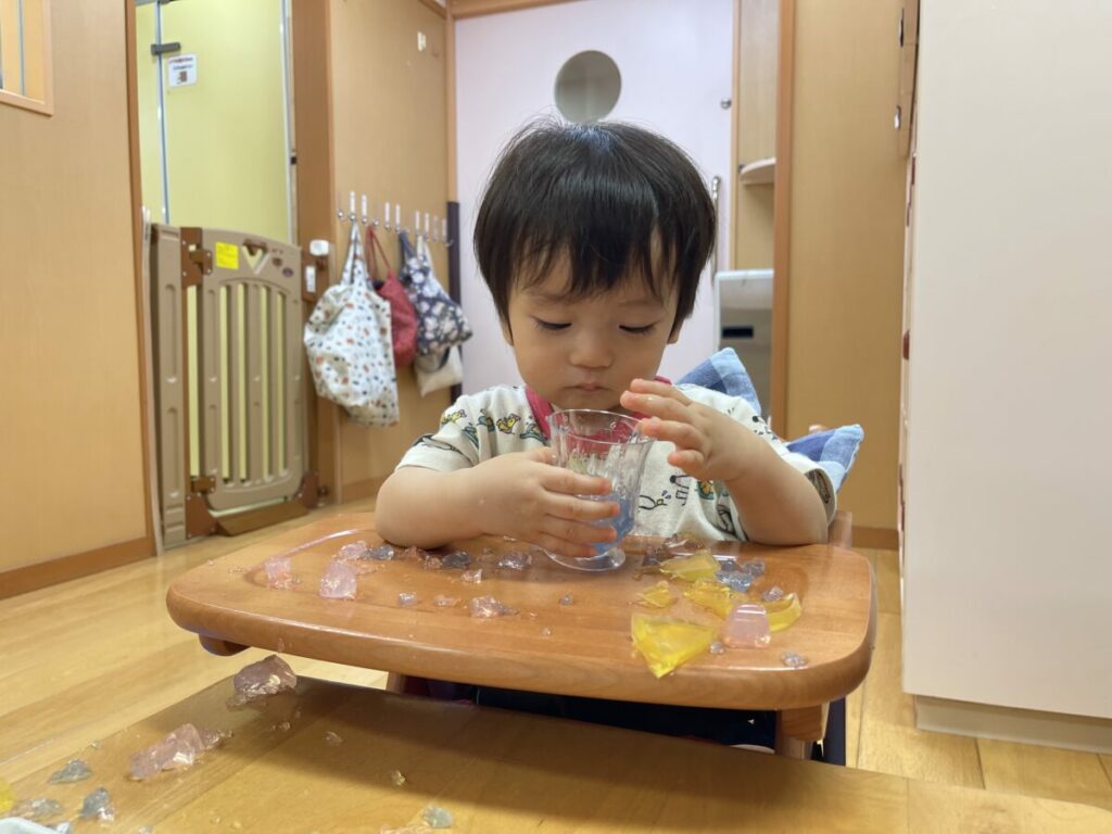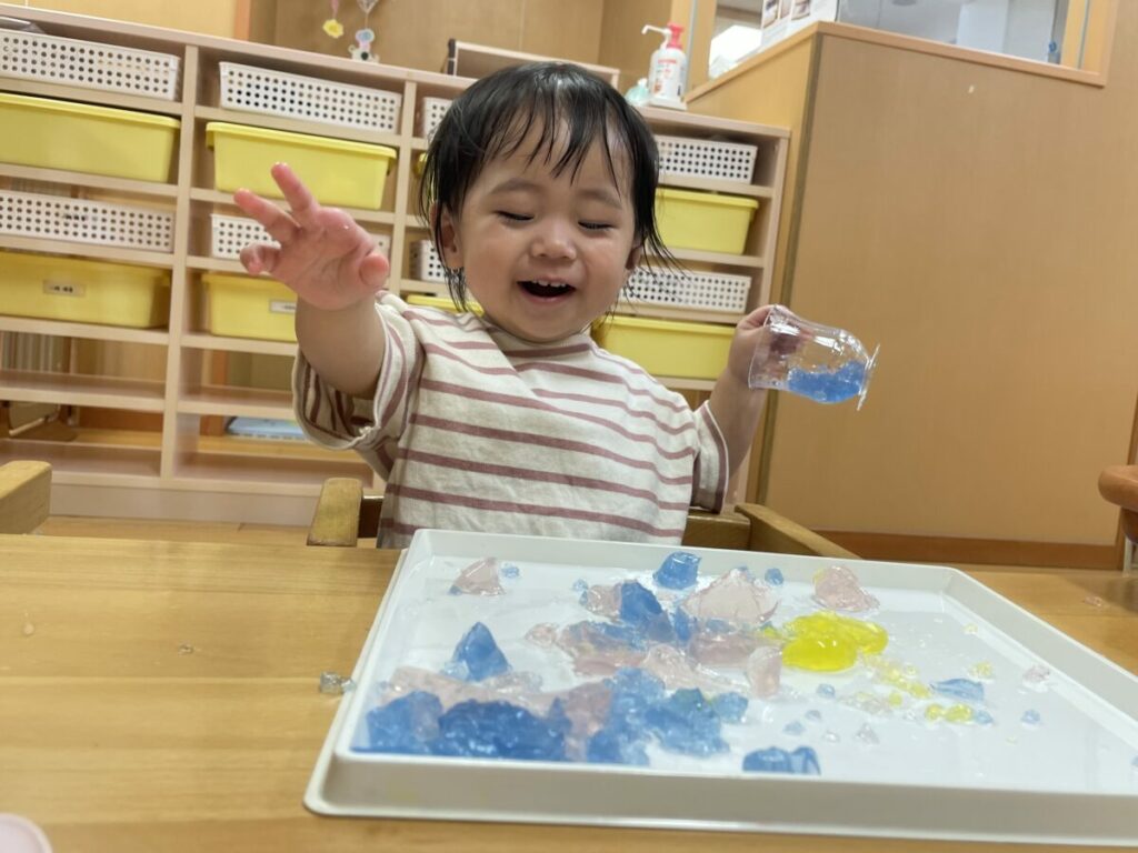 遊びを通して、五感で感じる楽しさを味わうだけでなく、手指やスプーンなどの道具を使った微細運動、体全体を使った粗大運動も自然と経験することができました。寒天遊びは、子どもたちの「やってみたい!」という気持ちを引き出す大切な学びの時間になっています。