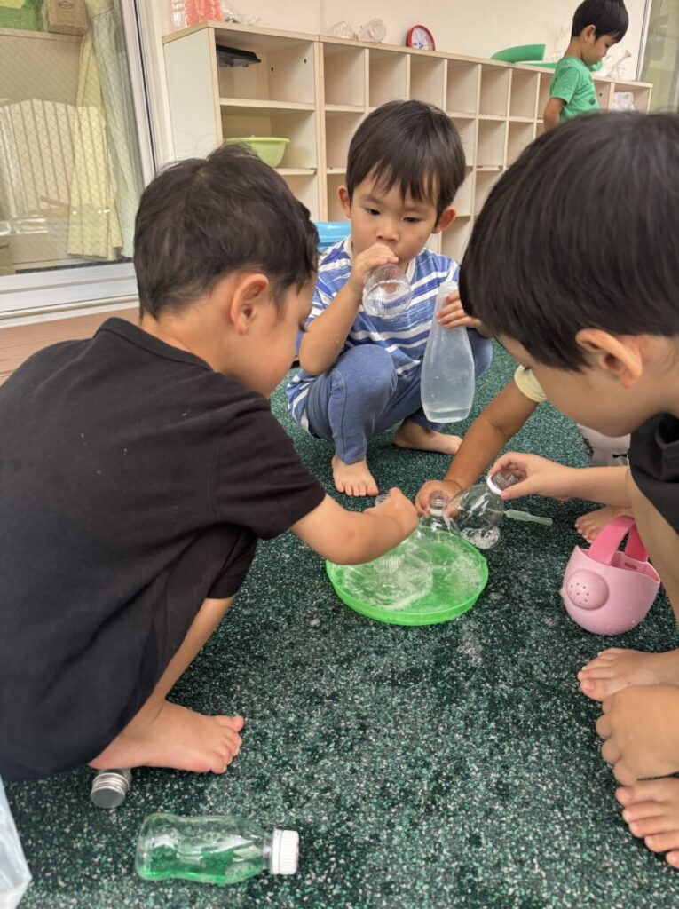 「なんでだろう?」「石鹸を増やしてみよう」「お水も入れた方がいいんじゃない?」と、子どもたちからは様々な意見が飛び交います。