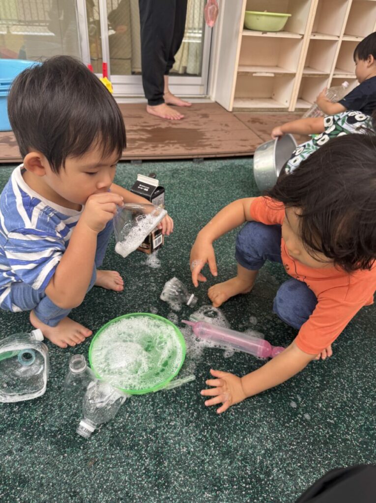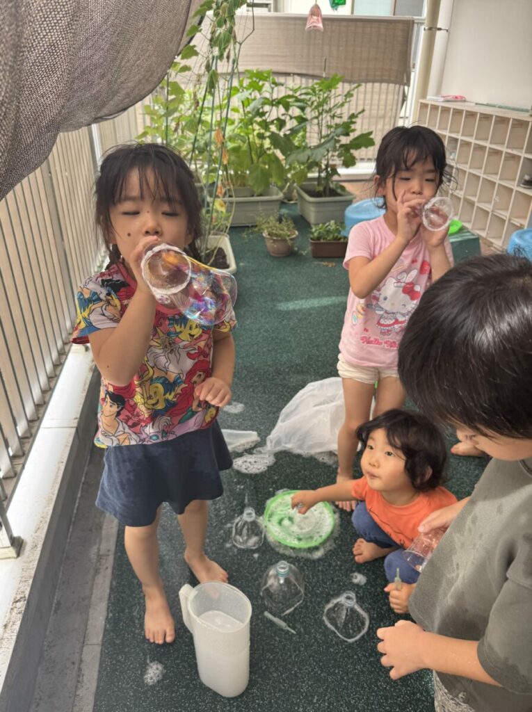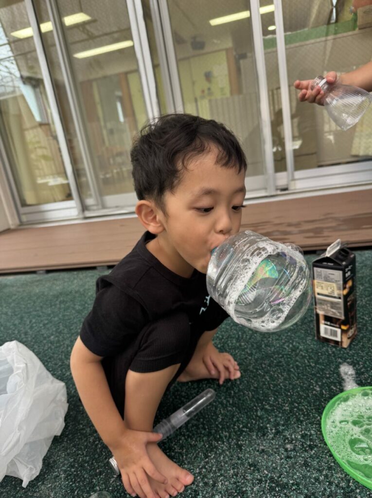 幼児クラスで、シャボン玉作りを体験しました。