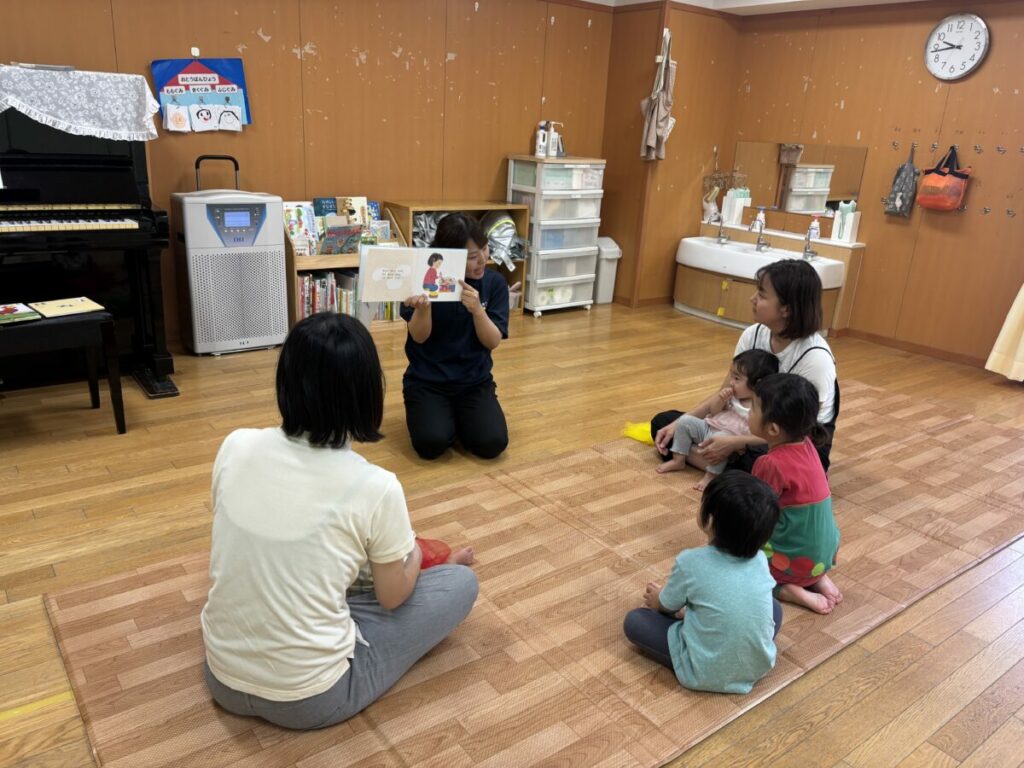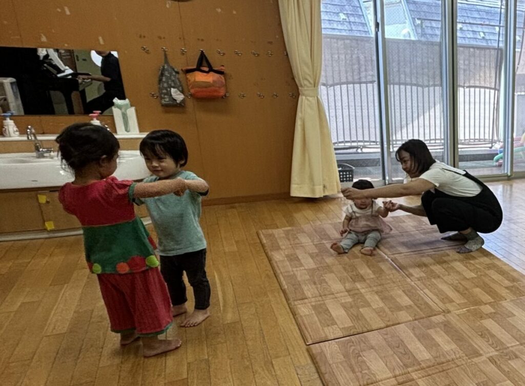 体をゆらゆら揺らしたり、ぴょんぴょんとジャンプしたり。今回は、2歳のお兄さんやお姉さんも参加してくれて、元気いっぱいに見本を見せてくれました。