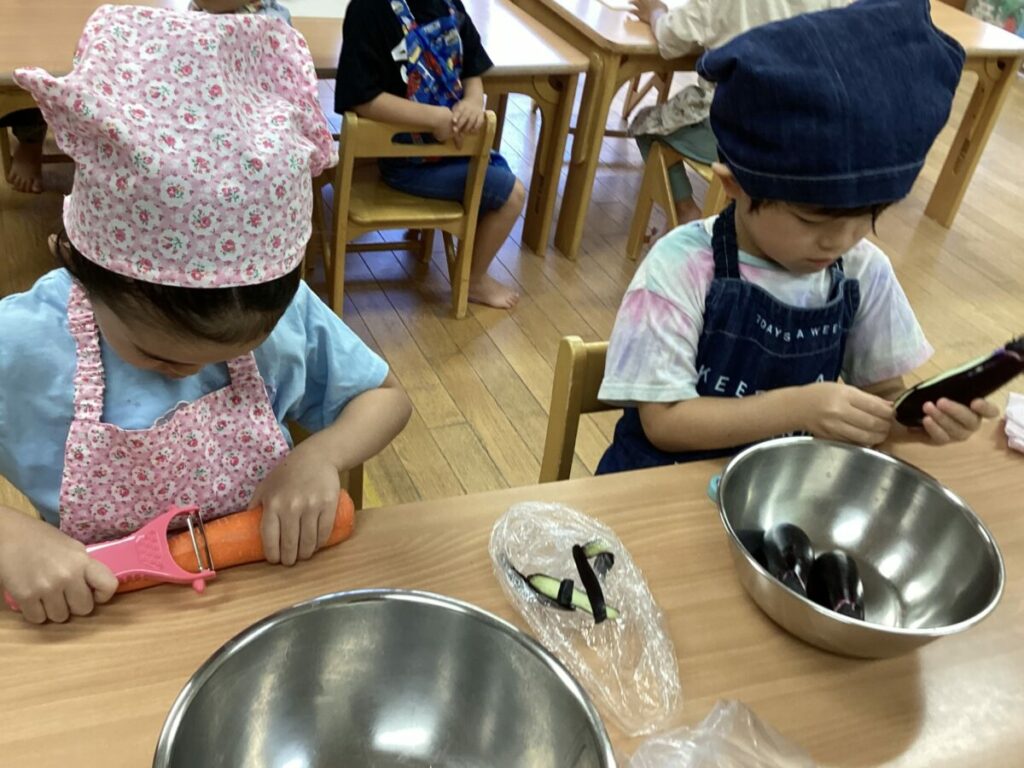 「どうやったらうまく切れるかな?」「皮をむくにはどうしたらいいかな?」と、作業の中でたくさんの“気づき”や“工夫”が生まれていました。