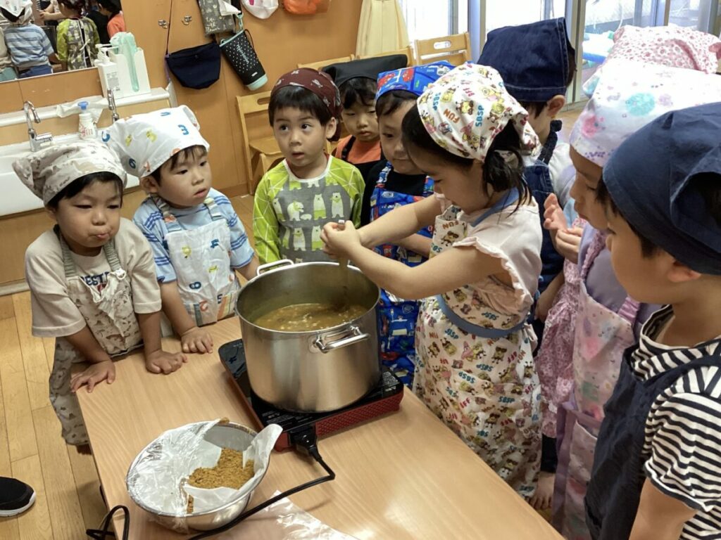 煮込むお鍋にルーを入れると、「おいしくな〜れ!おいしくな〜れ!」と呪文を唱えながら混ぜていた子どもたち。みんなの気持ちが込められて、さらに美味しくなったようです。