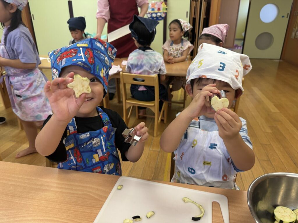 型抜きをしながら「ナスはやわらかいけど、にんじんはかたい!」と野菜の違いに気づいた子どもたち。立って押すと力が入れやすいことも見つけていました。