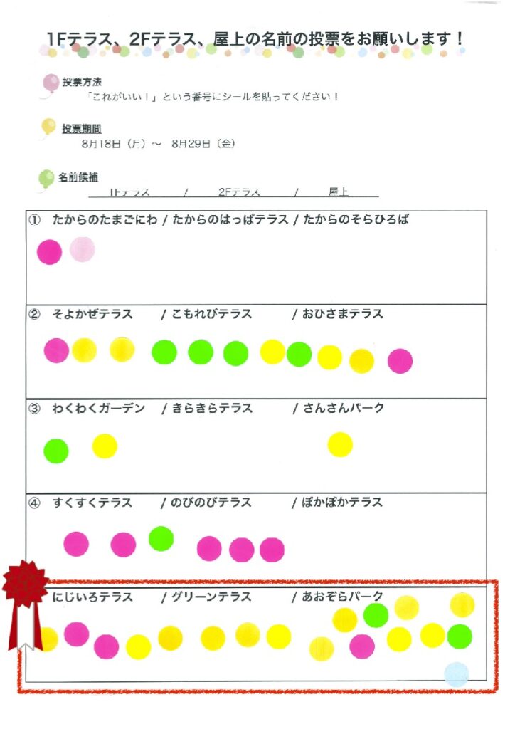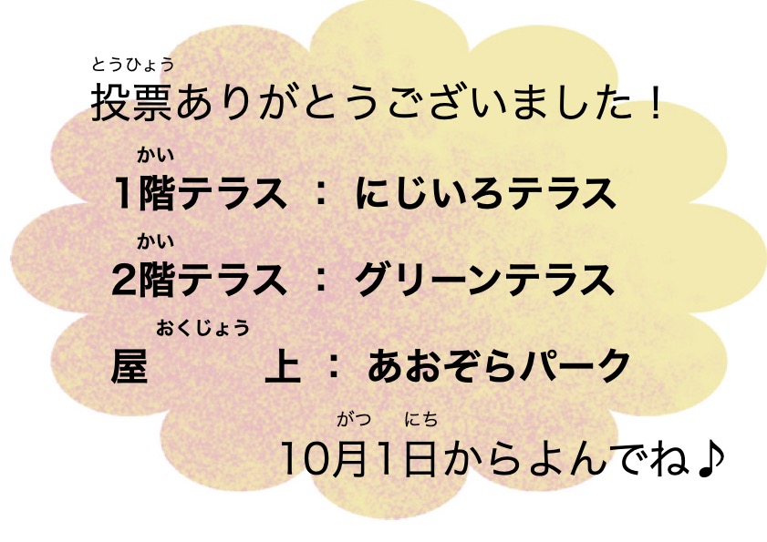 親子で相談して決めたり、字が読める大きいクラスの子は自分のお気に入りの名前に投票したり、職員も投票し、全員参加で園庭名を決定しました。