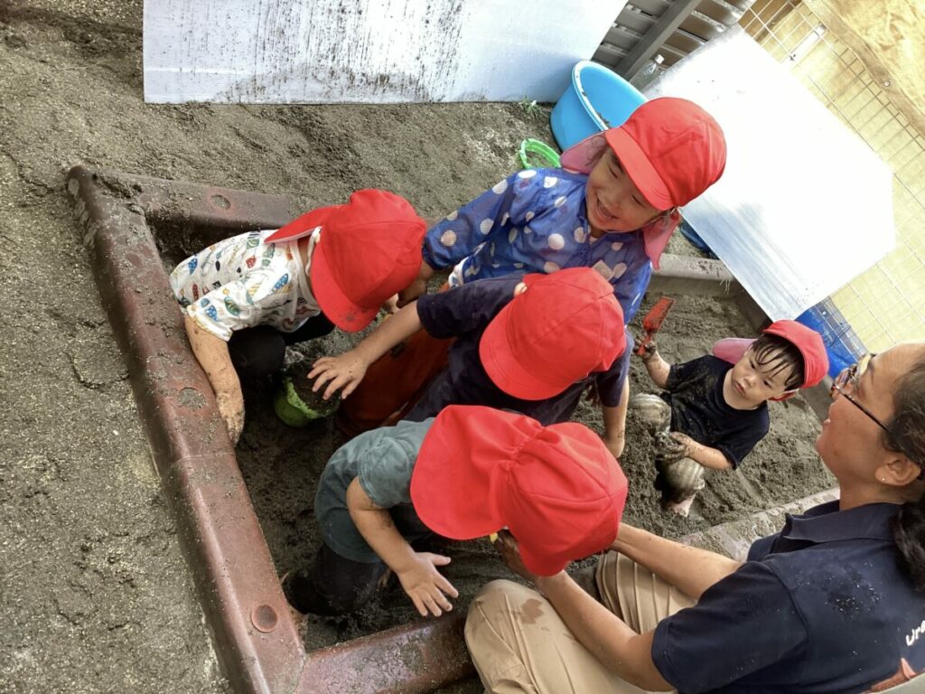 ウレシパモシリのゆかりん先生と一緒に園庭で砂遊びをしました。山を作ると自然に穴ができ、その穴に入ってみたり、水を流してみたり…。子どもたちの発想が広がり、遊びの中で工夫する姿が見られました。