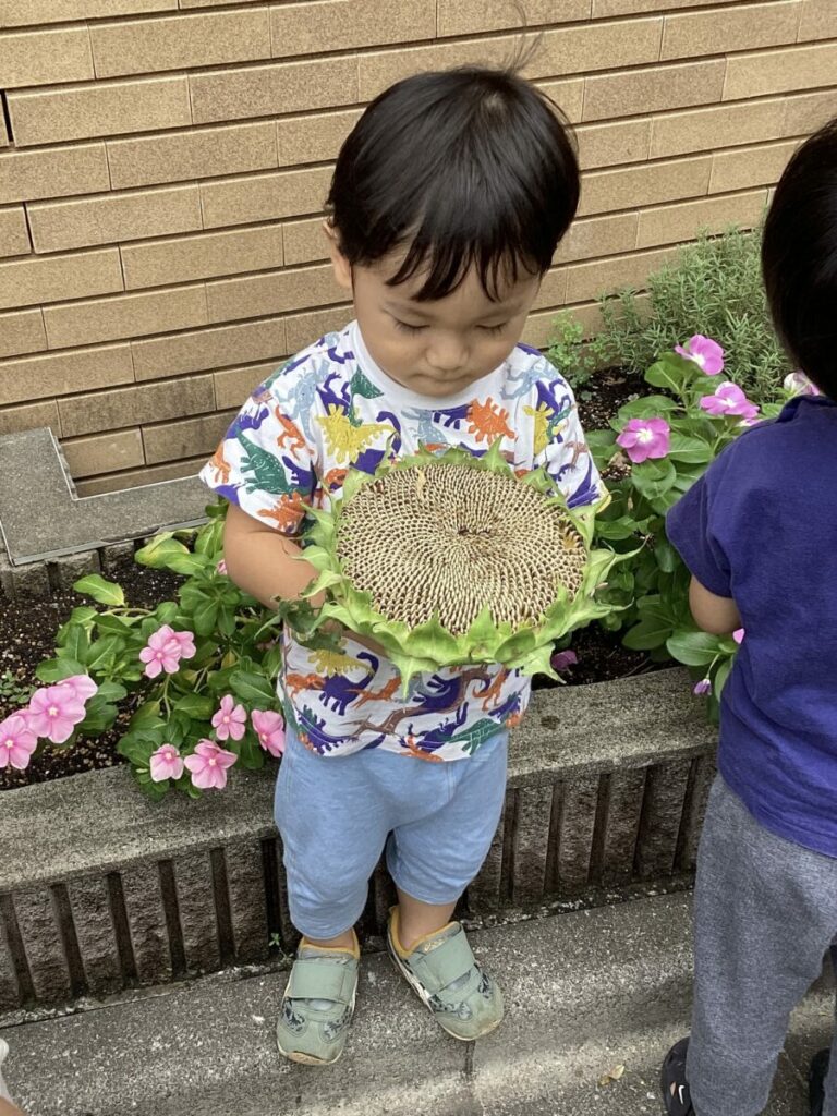 夏に大きな花を咲かせたひまわりのタネを収穫しました。ずっしりと重いタネに「これがたねなの?」と驚いた子どもたち。「おもたい」と言いながらも、落とさないように大切に持つ姿が印象的でした。自然の恵みに触れる中で、生命のつながりを感じていました。