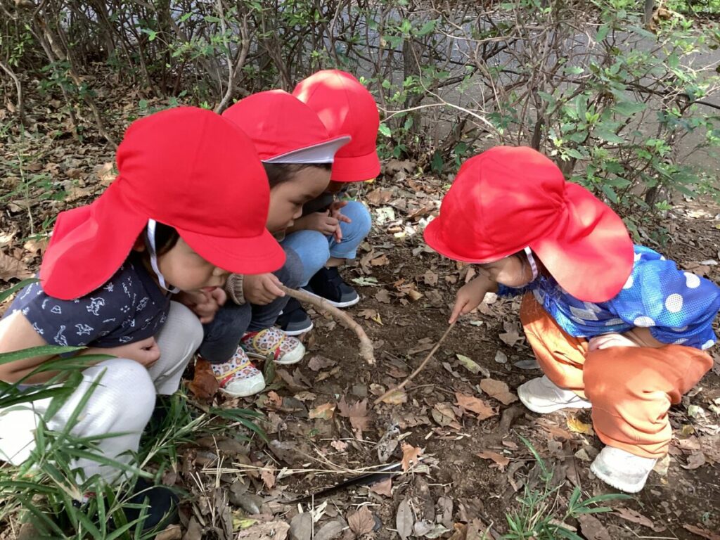 涼しくなってきたため久しぶりに林試の森へお散歩へ行きました。弱っているセミやバッタを見つけて観察する子どもたち。「もう動けないんだって。かわいそうだね」と伝え合い、命の大切さに触れる姿がありました。