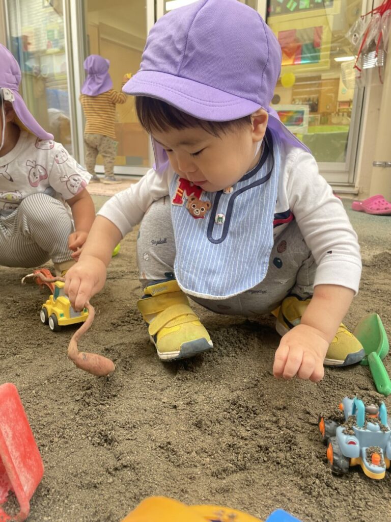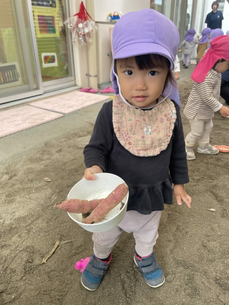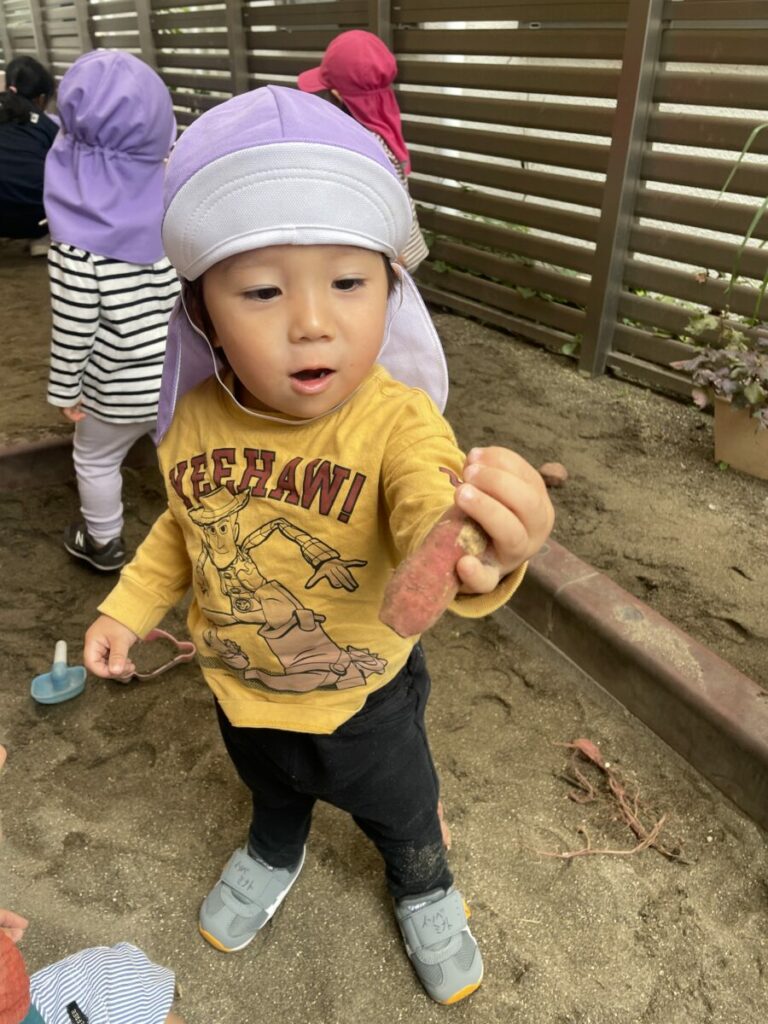 乳児さんには、握りやすい小さなサイズのお芋や、細長いお芋を「おすそ分け」してもらい、まずは感触を楽しみました。