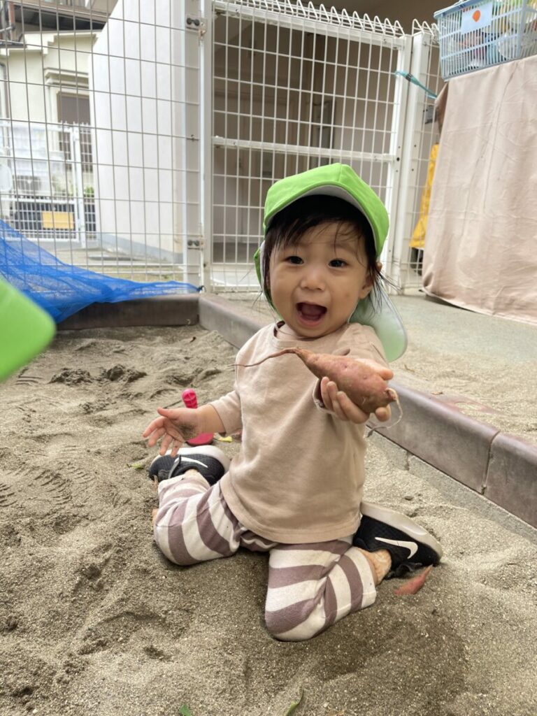 小さな手でで砂を掘ってみると…鮮やかなお芋がゴロン!