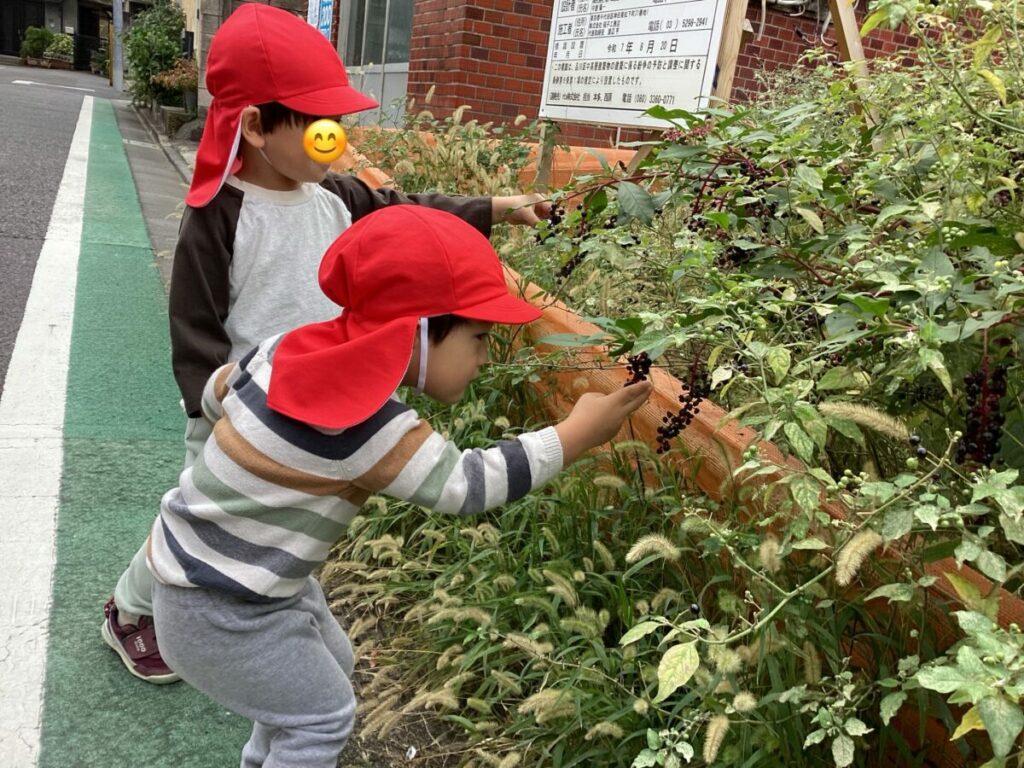 散歩の途中で木の実を見つけた子どもたち。「なんだー?」「ブドウみたいだね」と興味津々でじーっと観察する姿が見られました。身近な自然に触れ、五感を使って発見を楽しむ時間になりました。