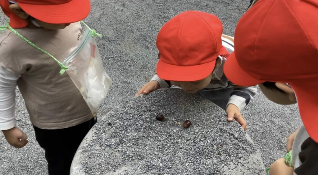 どんぐりの穴から出てきたどんぐり虫を観察。「どこが頭かな?」と見つめながら、「どんぐり食べたの?」「お腹いっぱいって言ってるのかな?」と想像を膨らませてお話ししていました。自然の中で小さな命と触れ合い、考えたり感じたりする力が育まれる時間となりました。