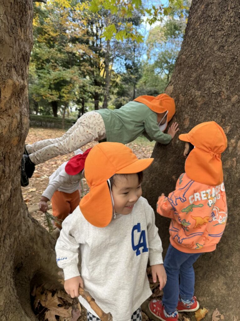 公園には、大きく太い木や小さく細い木、つるつるとした木肌の木など、種類や樹齢によって本当にさまざまな木があり、子どもたちも木と触れ合うのが大好きです。