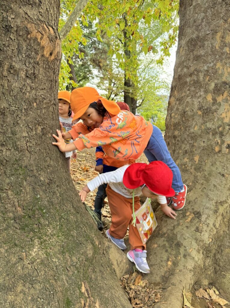 「見てみて!」と、まずは3歳児クラスのお友だちが、くっついた木の間に足をかけて登れることを嬉しそうに見せてくれました。