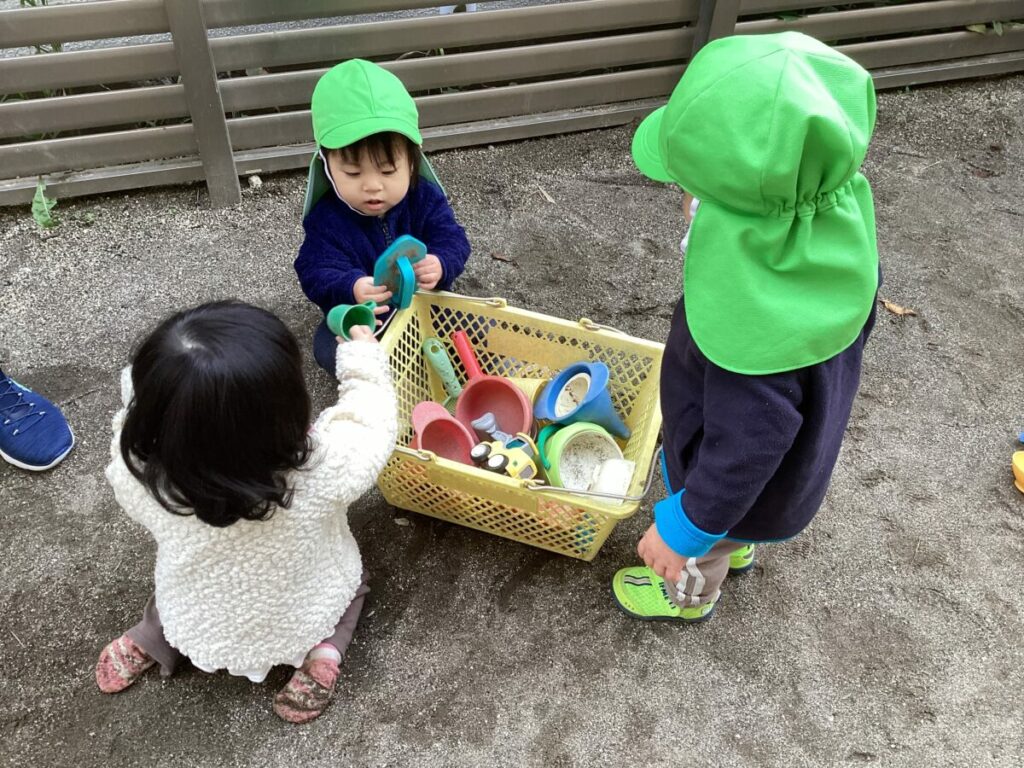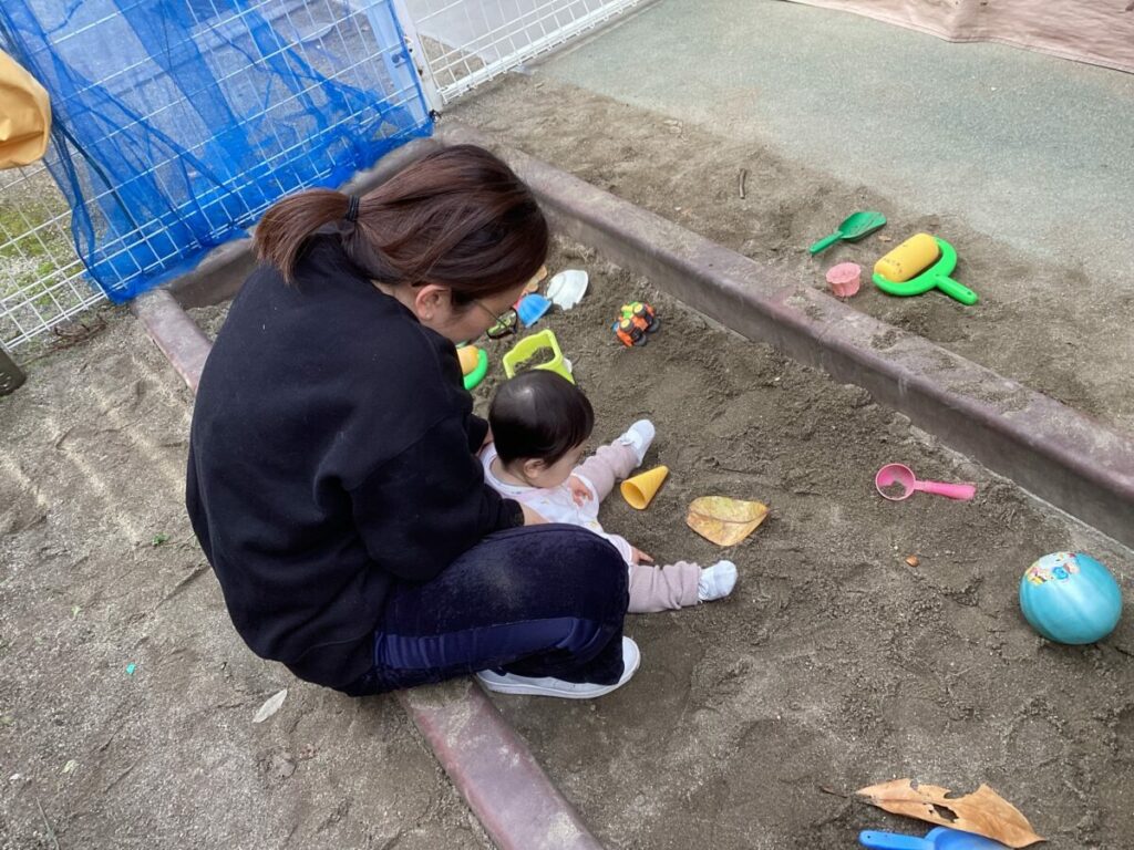 初めての砂遊び体験!お家の方と一緒に安心して過ごされている姿が印象的でした。手についた砂をじっと見つめて「何だろう?」と不思議そうな表情を浮かべている様子がとても可愛らしく、小さな気づきが生まれる素敵な瞬間でもあります。そして、遊びながら指先の使い方や感触の違いを感じ、自然と学びが広がっていきます。