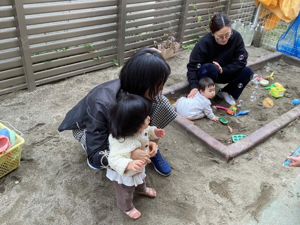 地域の方に来ていただき、0歳児ひよこ組さんと一緒ににじいろテラス(乳児園庭)で遊びました。