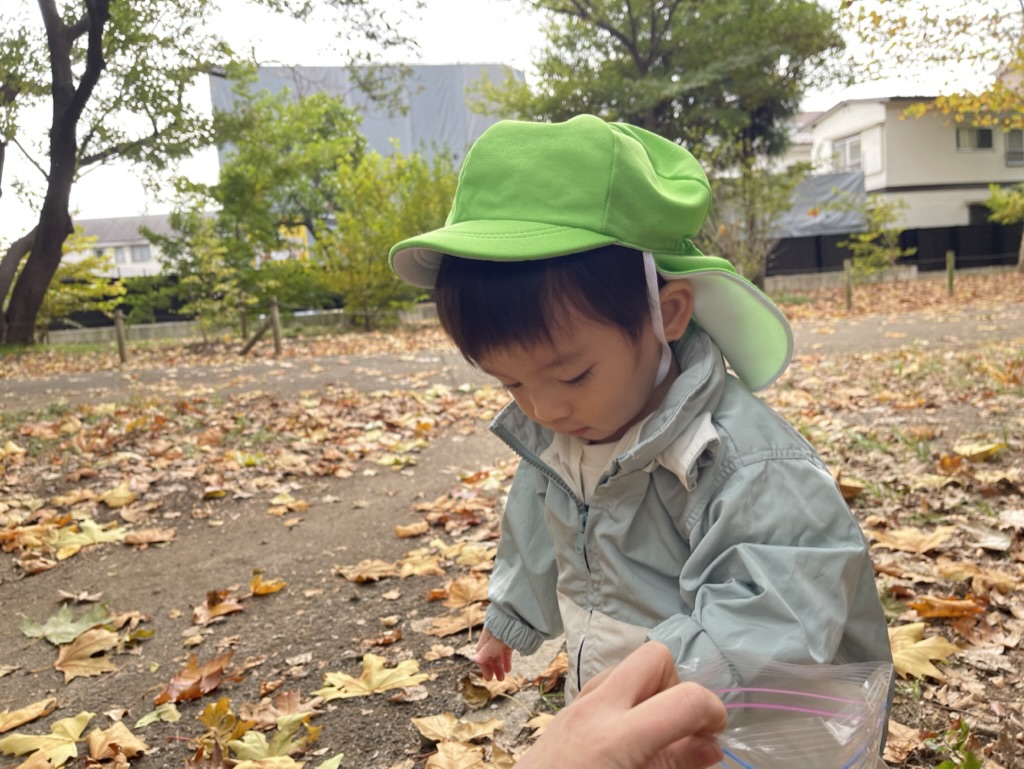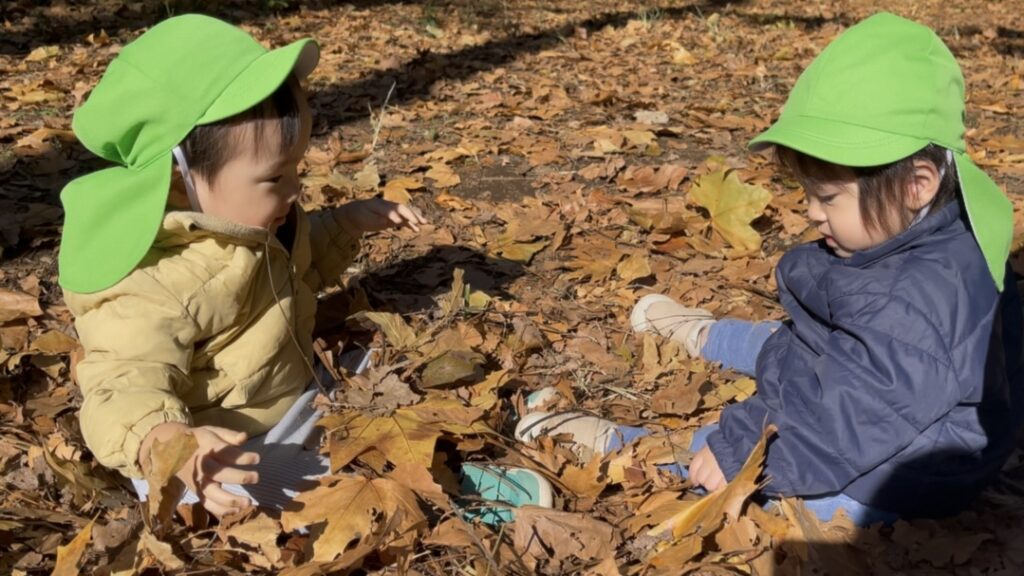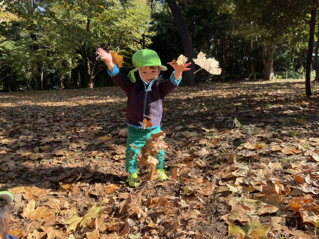 保育者がひらひらと枯葉のシャワーをすると、その様子をじっと見つめ、同じようにまねっこをする姿がありました。
