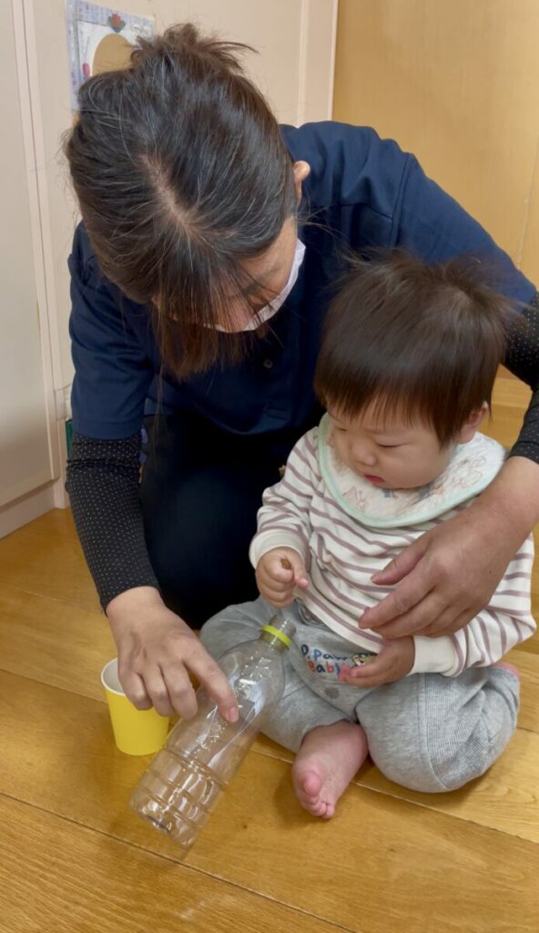 小さなどんぐりをつまむ動作は、0歳児の指先の発達にぴったりの“学びの機会”になっています。