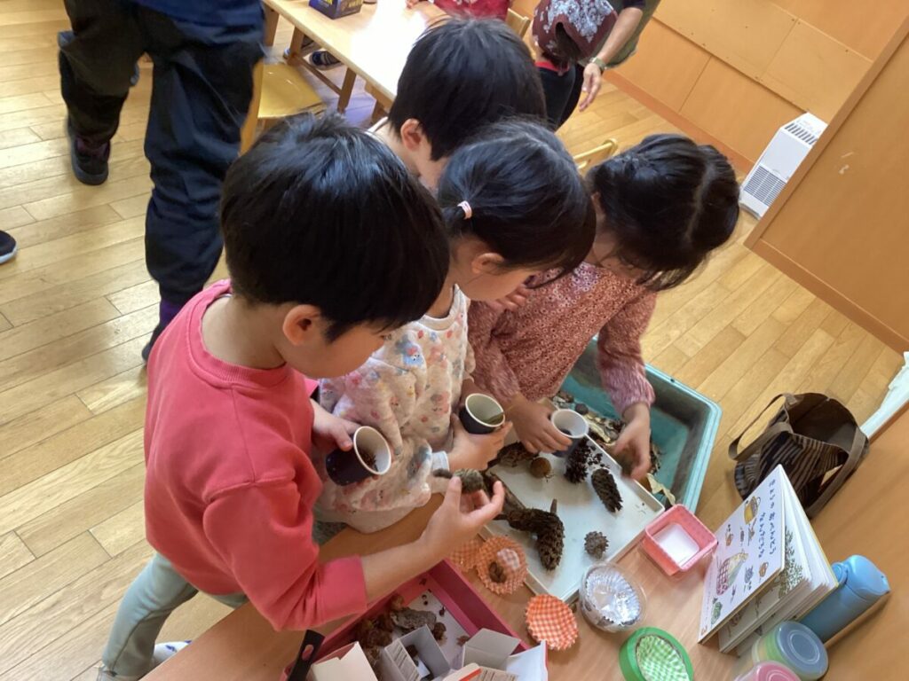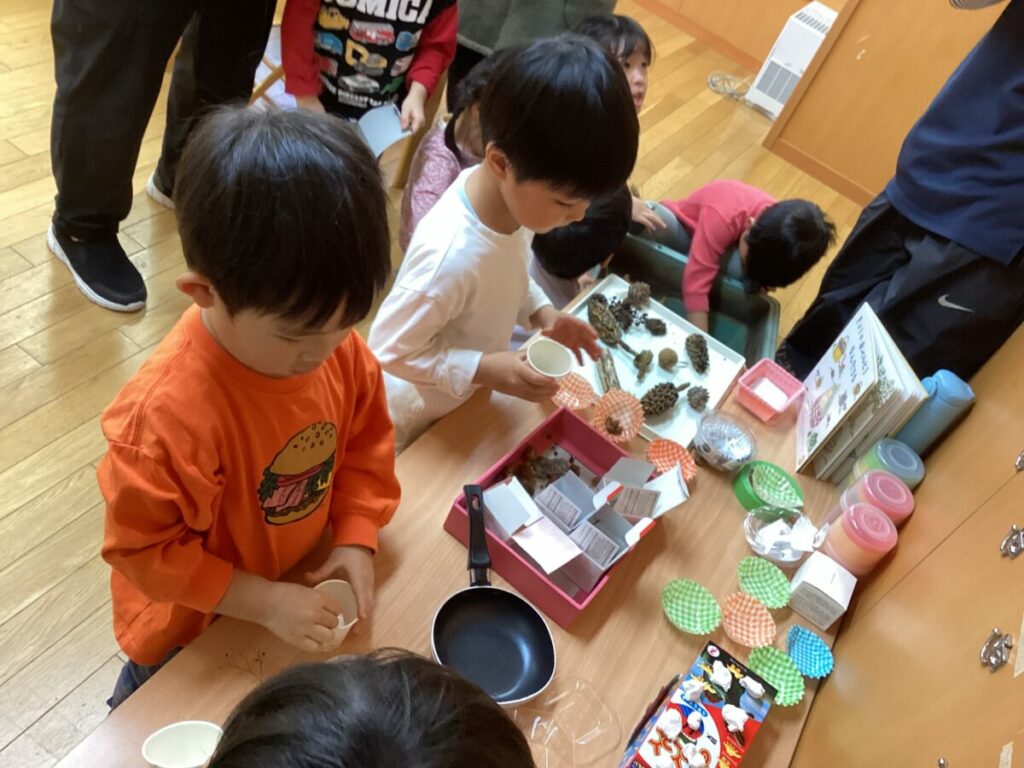 いろいろな素材に触れながら『どれにしようかな?』『なに作ろうかな?』と子どもたちのやりとりはまるで本物のお店屋さんのようです。選ぶ姿は真剣そのもの、自然物の魅力に引き込まれ、ひとつひとつの素材選びにも興味が深まっていきます。