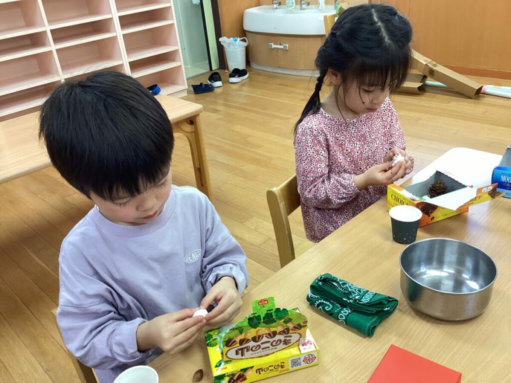 お買い物ごっこで買った木の実を使って、待ちに待ったこびとさんへのお弁当作りのスタートです。