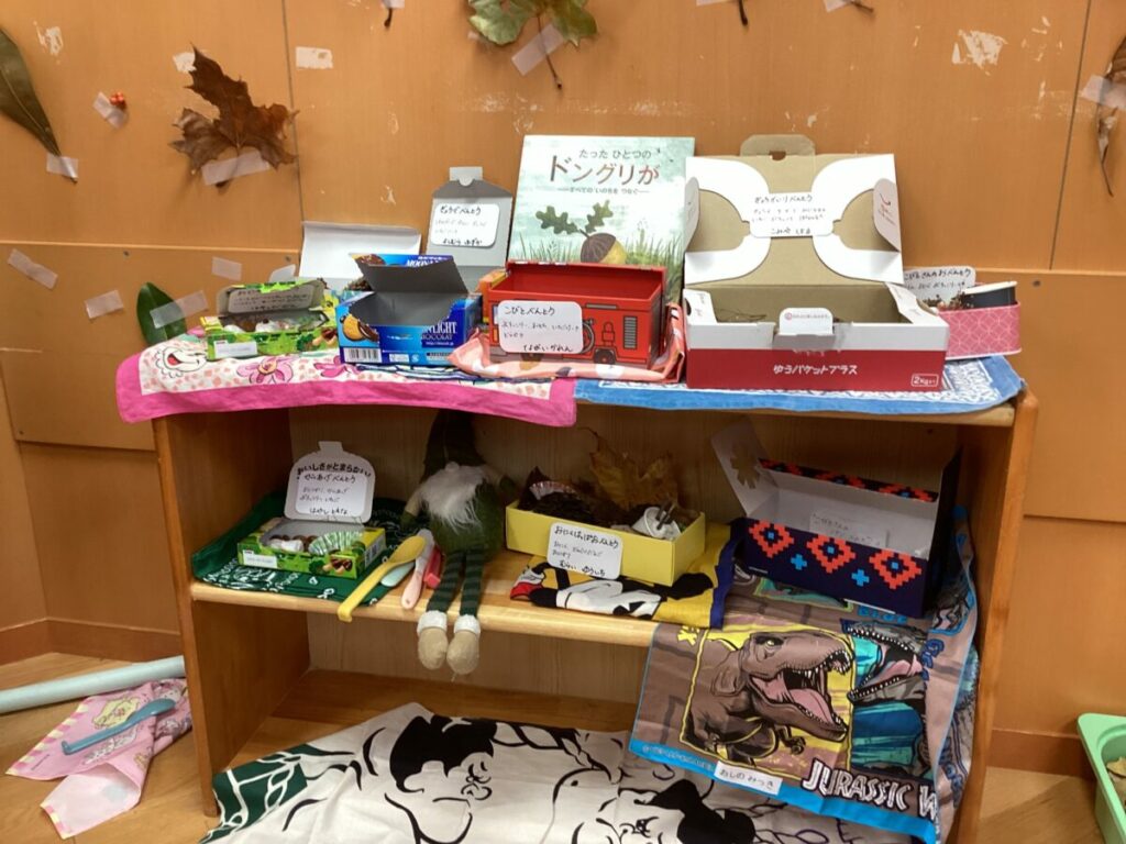 テーブルの上にはさまざまな木の実がずらりと並び、森から届いたプレゼントが美味しい食材に大変身!友達と楽しそうにやりとりしながらお買い物ごっこが始まりました。