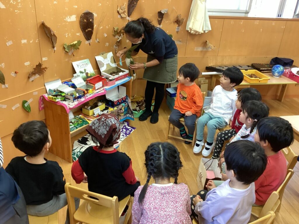 『森の贈り物・木の実あそび』をテーマに、自然物いっぱいの遊びを楽しみました。子どもたちが手にしたのはこびとさんから届いた『木の実のプレゼント』。ころんとした形や色に触れながら『これなんだろう?』『いいにおいがする!』と五感を働かせ、自然を全身で感じていました。