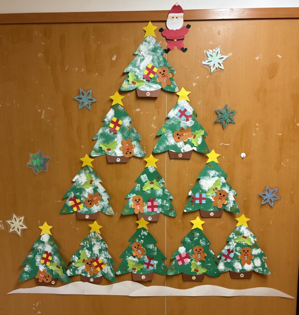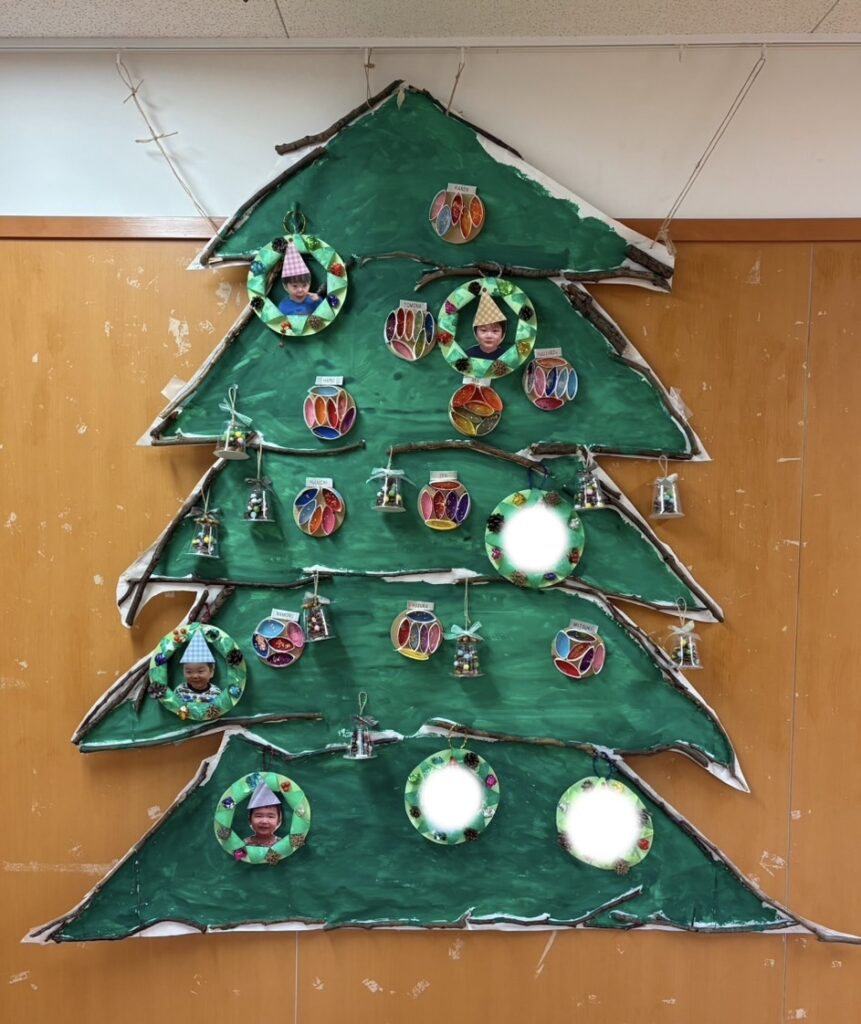 今日は楽しいクリスマス。子どもたちの会話は、サンタさんの話でもちきりです。 今日は、みんなで作った素敵な手作りツリーをご紹介します。