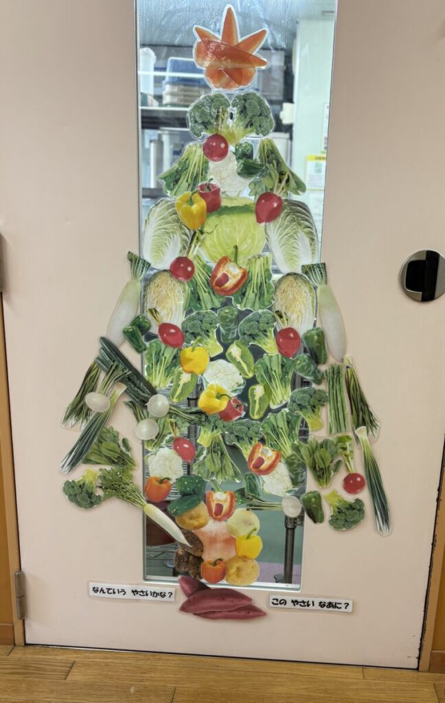給食室の前は、なんと「野菜」でできたクリスマスツリー! 思わず立ち止まって見てしまうような、素敵な飾りに心が温まりました。