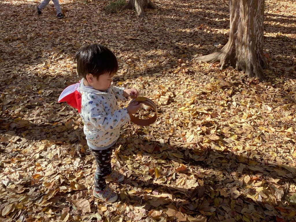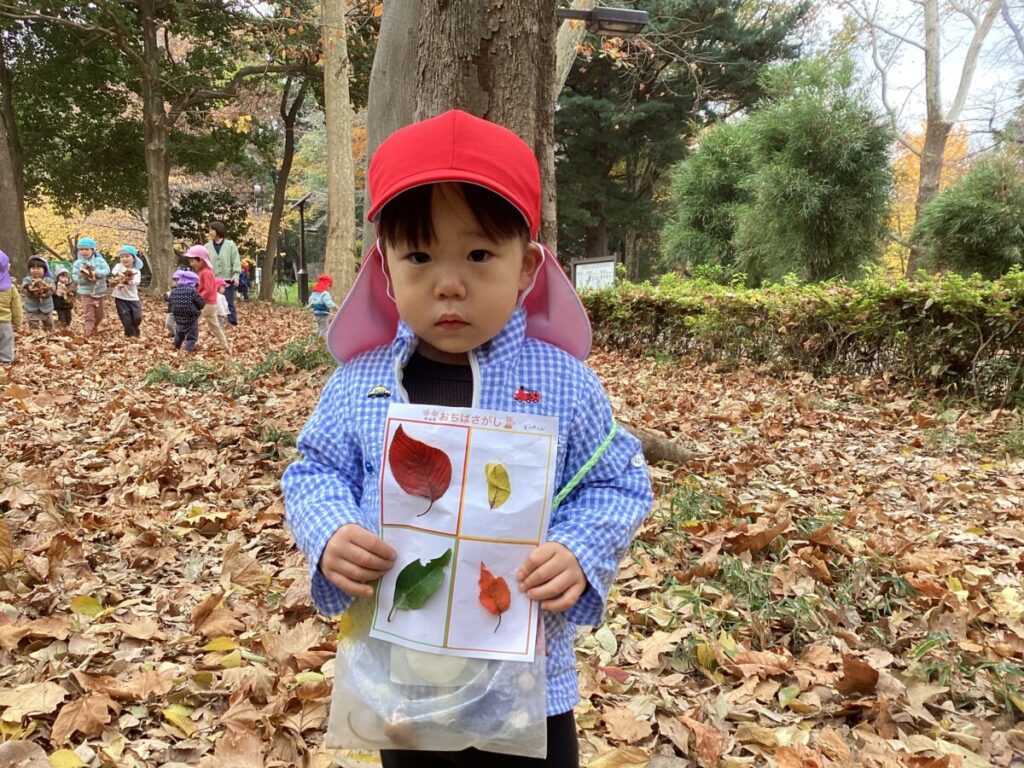 探索カードを手に、カードと同じ色の落ち葉探しに出発。「どこだー?」と周りを見渡しながら歩き、きれいな葉っぱを見つけると「あったよ!」と、とても嬉しそうな表情を見せてくれました。色や形の違いに気づき、自分の目で確かめながら探す姿に、子どもたちの“発見する力”が育っていることを感じます。