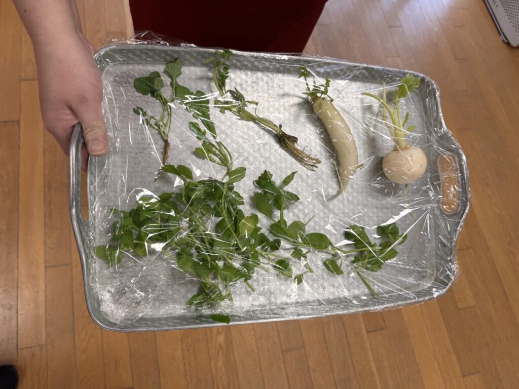 実際に見て触ってみると、「あっこれはかぶ!」「小さい大根だ!」「ふわふわしてるね!」など、気づいたことを言葉にしながら七草に興味津々の子どもたち。