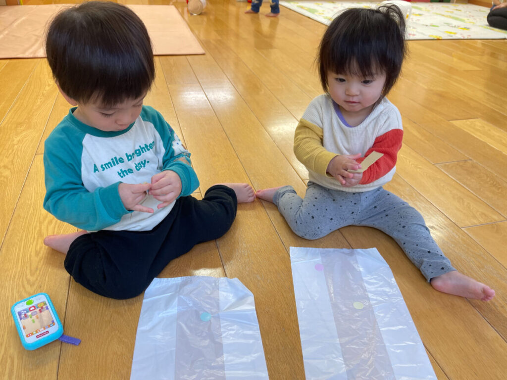 まずはビニール袋にシールを貼って飾りつけ。シールを剥がしたり貼ったりすることが大好きな0歳児クラスの子どもたち。指先に力を入れて剥がし、狙ったところに貼ろうとする真剣な表情が見られました。一つひとつの動きの中で、指先の感覚や「できた」という達成感を味わっていました。