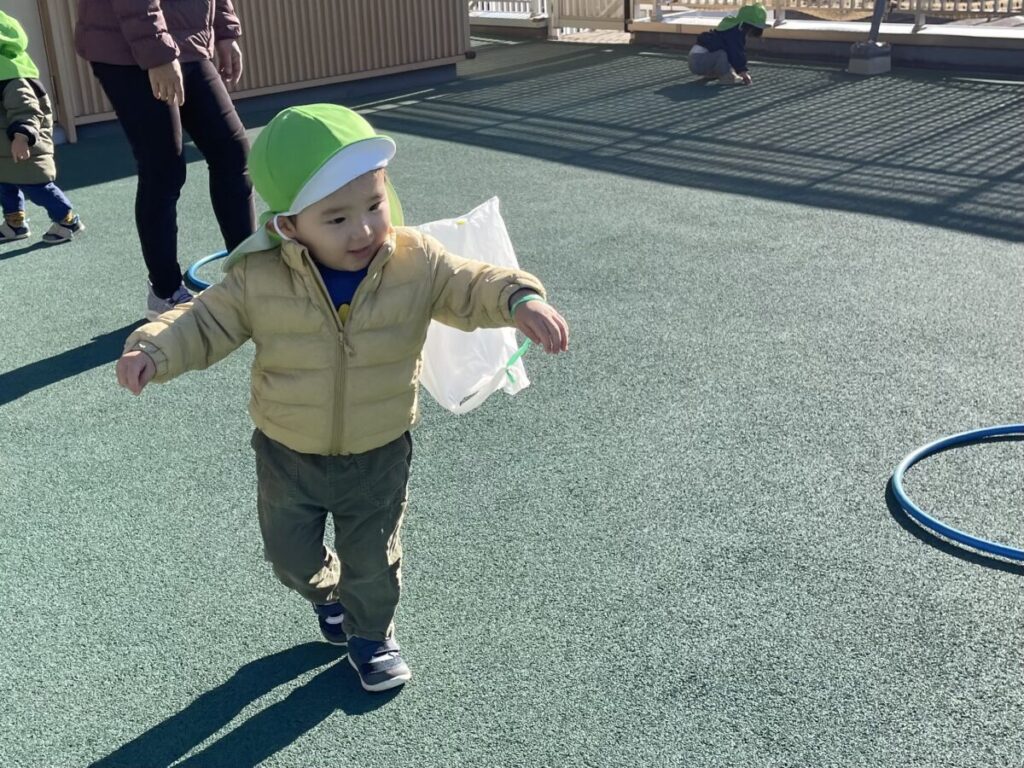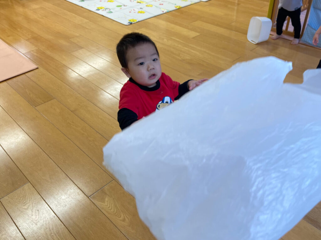 年明けの保育の中で、0歳児クラスではビニール袋を使った凧あげ遊びを楽しみました。身近な素材から、子どもたちの「やってみたい」が自然と広がっていく時間です。