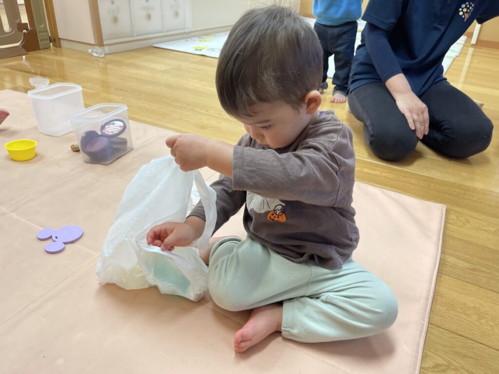 一つの素材から、貼る・投げる・追いかける・見立てる・振るといった遊びへと広がった今回の活動。遊びの中で、手指の動きや体の使い方、「やってみたい」という気持ちが自然と育まれています。0歳児にとっての遊びは、そのまま学びにつながる大切な時間です。