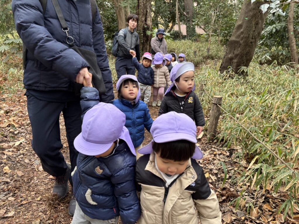 2月に入り進級を意識しながら、林試の森公園までの往復の道をお友だちと手を繋いで歩いたり、座ってお話を聞いたりと、大きな成長の一歩を少しずつ重ねている子どもたちです。