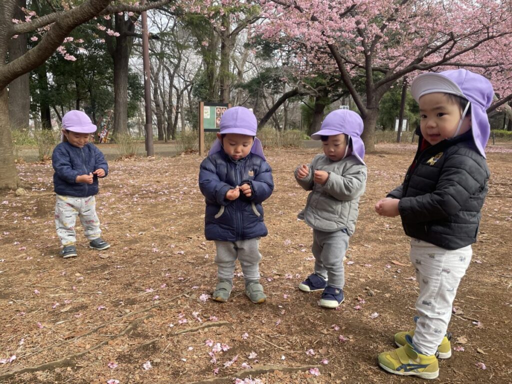 地面に落ちていた河津桜を拾い、花びらを一枚ずつ外していました。指先に伝わる「プチッ!」という感覚が面白かったのでしょうか。真剣な表情で何度も拾い繰り返していました。