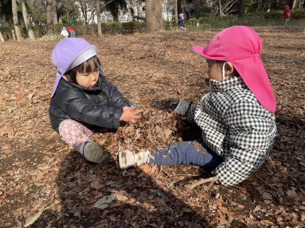 歩くことも、お友だちと一緒に遊ぶことも、いつの間にか自然な姿となってきました。林試の森公園での時間の中で、自然物に触れながら遊びを広げたり、同じ遊びを共有したりする姿の一つひとつに、子どもたちの成長を感じています。