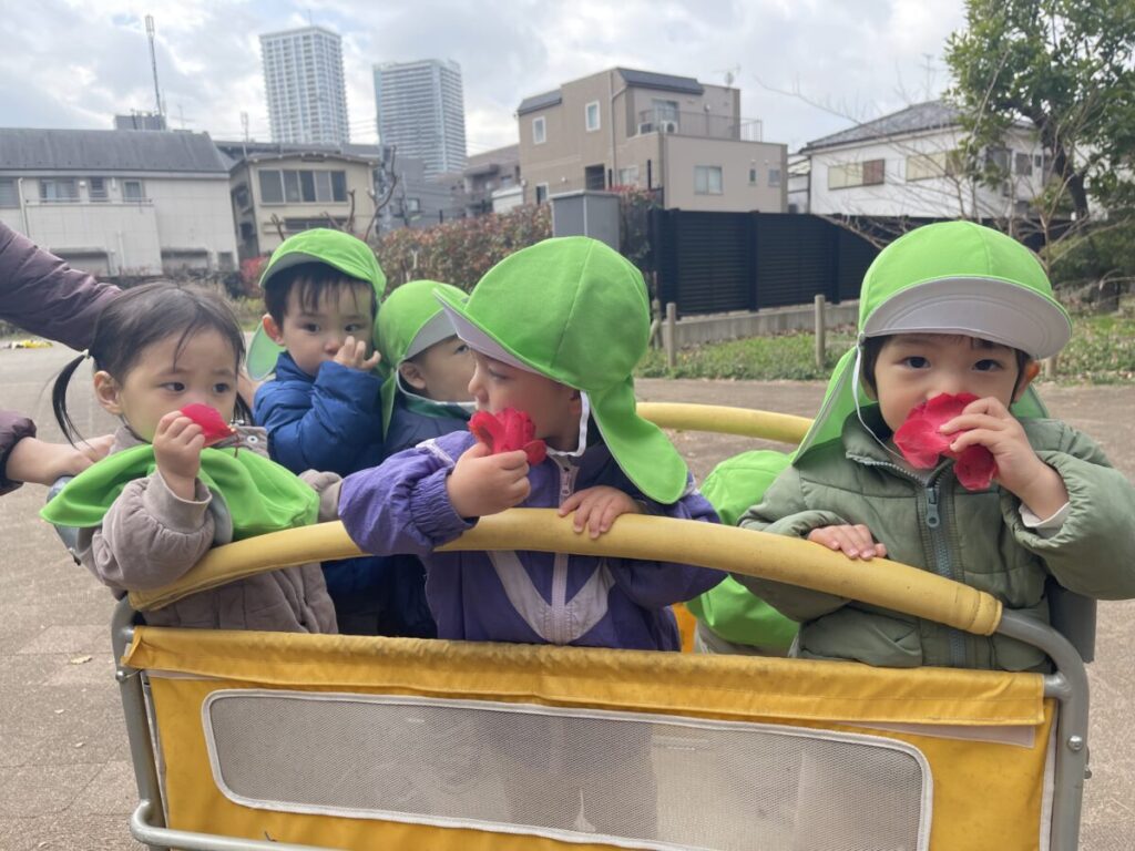 保育者が「においがするかな?」と声をかけると、くんくんと匂いを確かめていました。