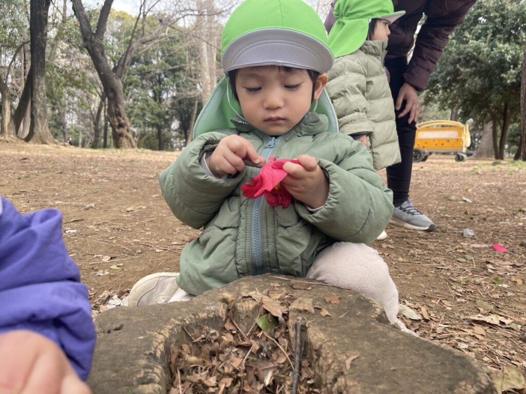 花びらがなくなると、「はっぱ」「あっち?」とお話ししながら、他の葉っぱでもできるか探していました。