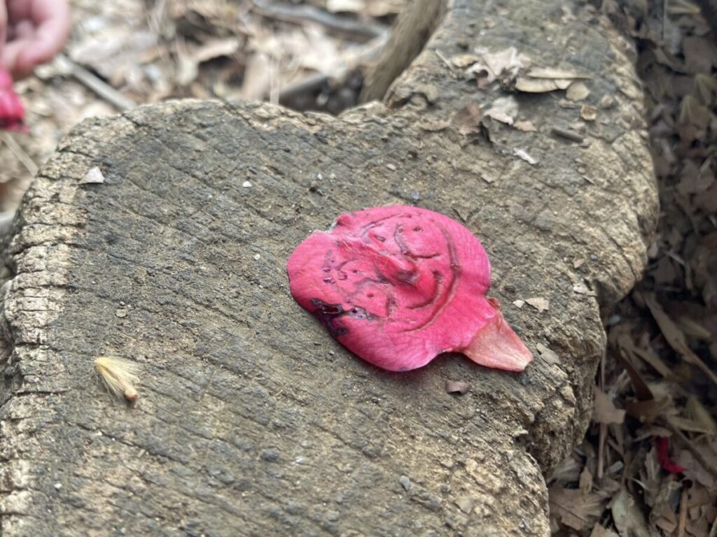 花びらをちぎって遊んでいる中で、枝を「どうぞ」と渡してくれたので、保育者が花びらに枝で絵を描いてみました。
