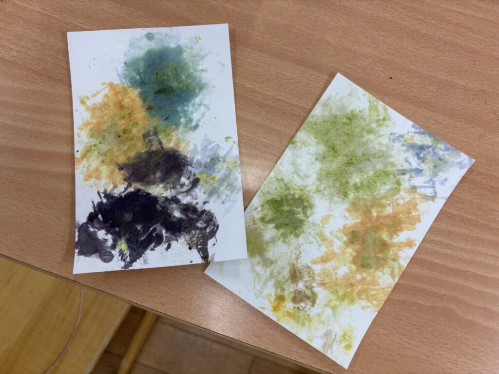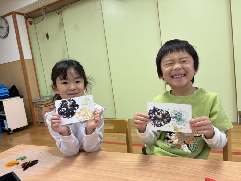 1回目は力いっぱい叩いていた子どもたちも、2回目には力を加減しながら、花の形が分かるように工夫していました。