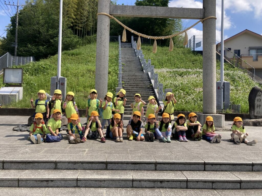 やまた神社の長い階段の段数を数えながら楽しんで上りました。最後にみんなでお参りをして、「次はどこに散歩に行こうかな」と考えながら園まで帰りました。