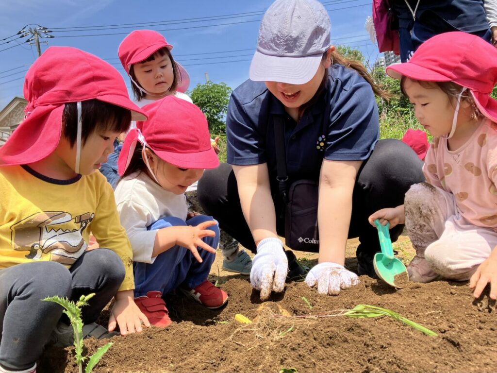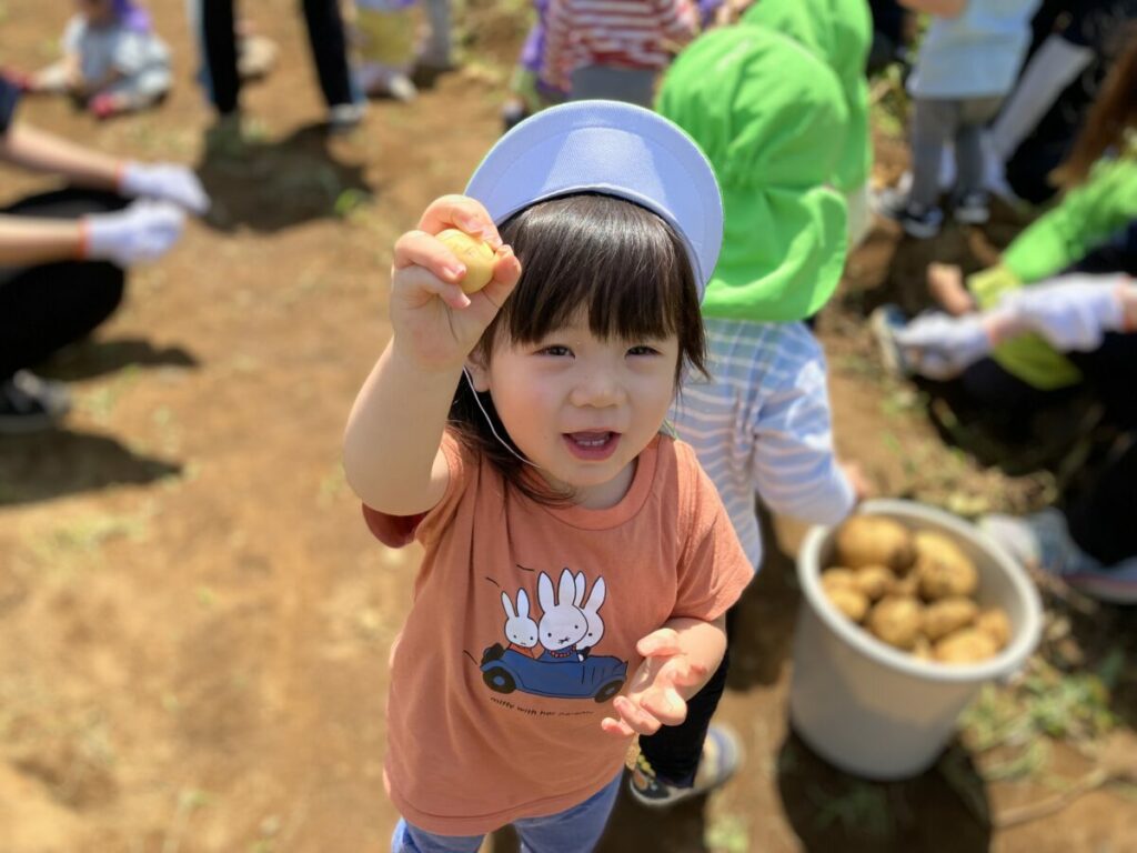 幼児クラスになるとお宝探しのようにじゃがいもを探し当て、たくさん自分のビニール袋に入れていました。「こんなにたくさんじゃがいもがとれて毎日じゃがいもパーティーだね」「フライドポテトにしてもらおうかな」と嬉しそうに話す姿がなんとも微笑ましかったです。