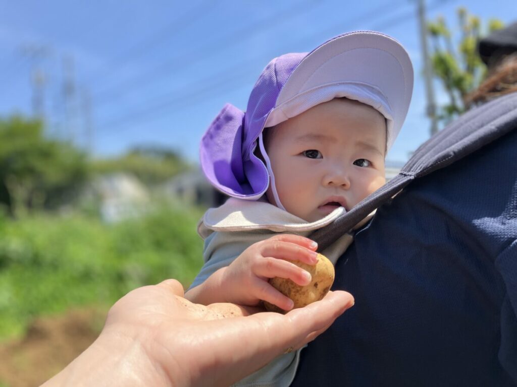 0歳児は畑に着くと、ふかふかの土を触れていました。コロコロと転がるじゃがいもを追いかける姿もあり、初めてのじゃがいも掘りを楽しんでいました。