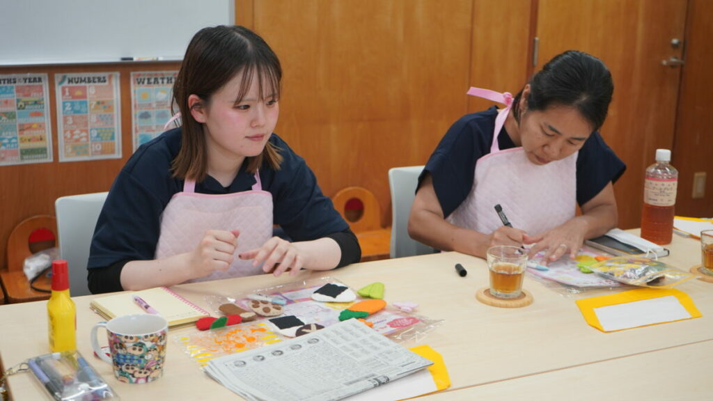 今回は、『おべんとうばこのうた』のエプロンシアターを作成しました。子どもたちが喜んでくれる姿を想像しながら作り、その後演じるポイントを学んでから実際に演じて練習をしました。
