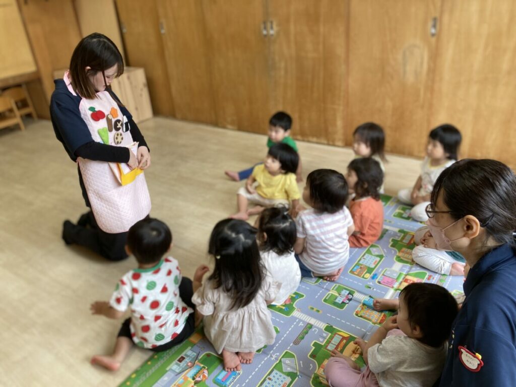 まずは『おべんとうばこのうた』の手遊びをすると、聞き馴染みのある曲にノリノリの子どもたち。その後、お弁当箱の具材が保育者のポケットから出てくると目を丸くして見る姿がありました。