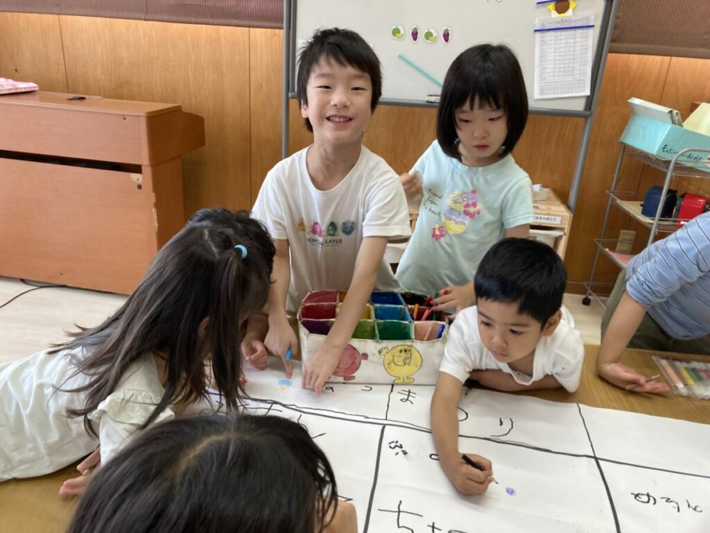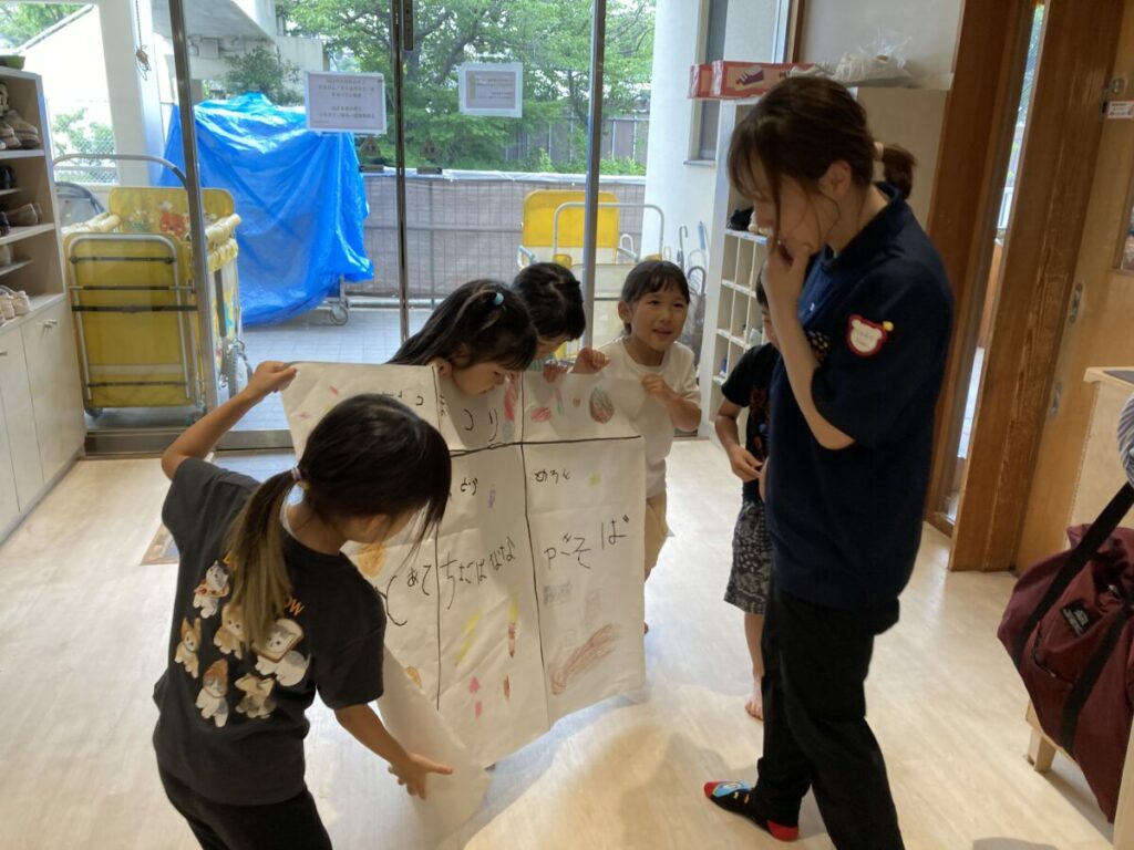 今年の夏祭りごっこでは、4,5歳児が店員さんとなり、他クラスの子どもたちをお客さんとして招待します。