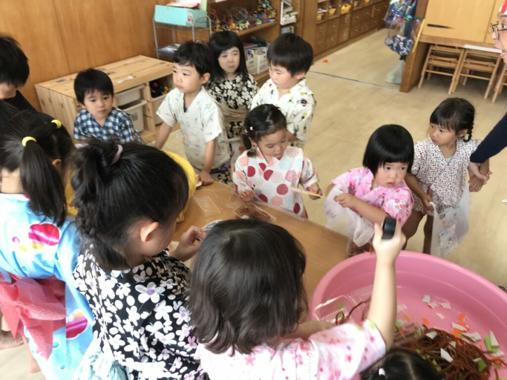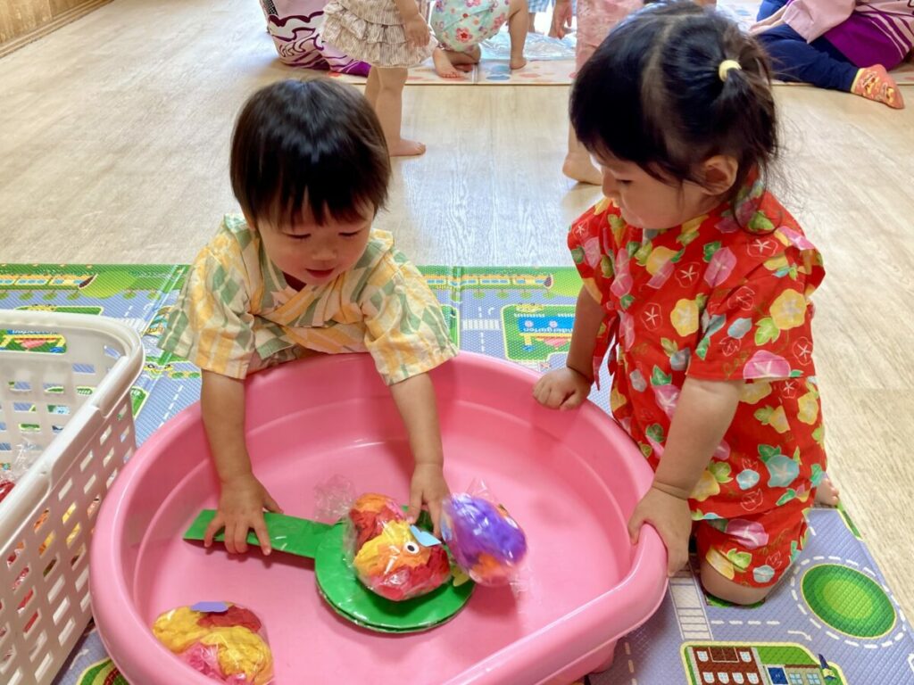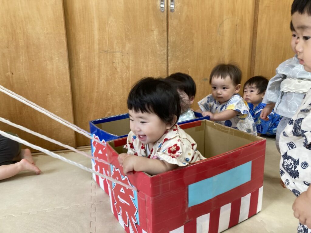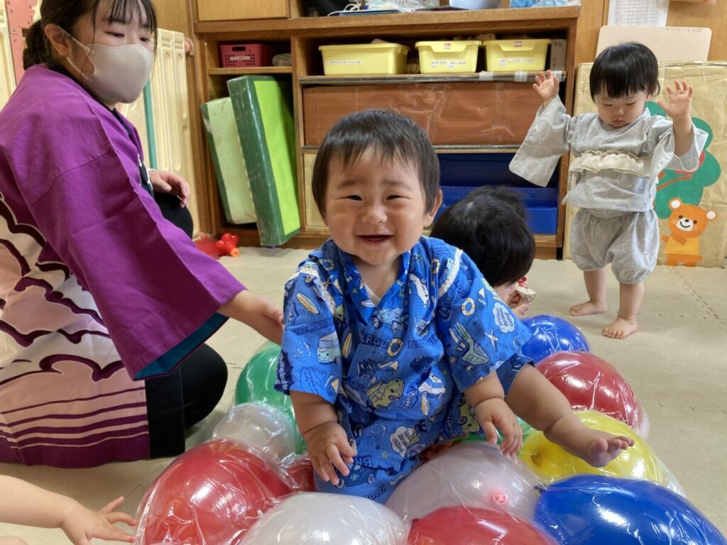 乳児クラスでは、風船マット、ウォーターマット、箱バス風神輿、金魚すくいなどを楽しみ、夏祭りの雰囲気を楽しみました。