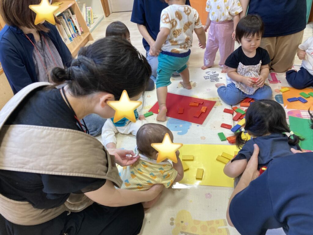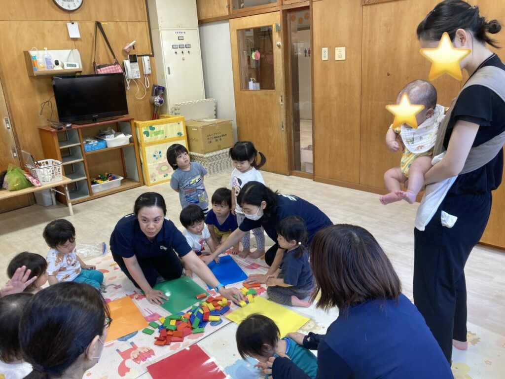 先日の子育て支援は、1歳児クラスの在園児との交流保育でした。英語講師と一緒に歌を歌ったり、ブロックを色別に分けたりして楽しみました。