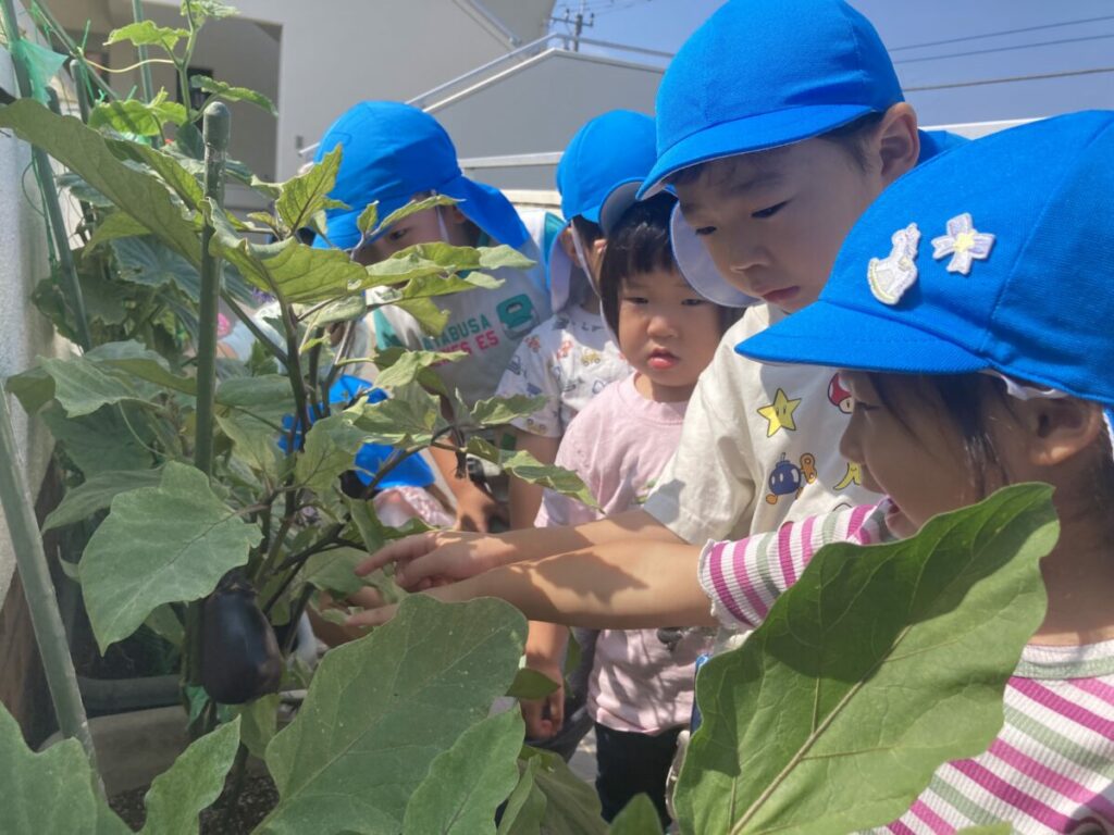 ナスが実ると「先生、ナスが出来ているよ」と大喜びの子どもたち。ナスを収穫して触ってみると「固いね」や「ブヨブヨしているよ」と感じたことを、子ども同士で話す姿が見られました。