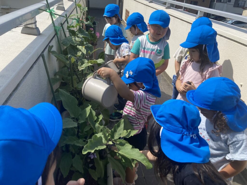 みかん組でナスを育てています。水やりをすると「背が大きくなったね」「葉っぱがたくさんだね」「紫の花が咲いているよ」など、様々なことに気付き、ナスが大きくなるのを楽しみにしていました。