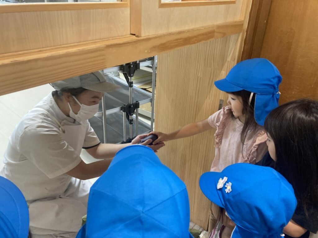 調理室へナスを持って行くと、以前は調理師さんに人見知りして緊張していましたが、食育を通して調理師さんと関わっていくうちに、子どもたちから話し掛けるようになり「美味しくしてね」とお願いしていました。